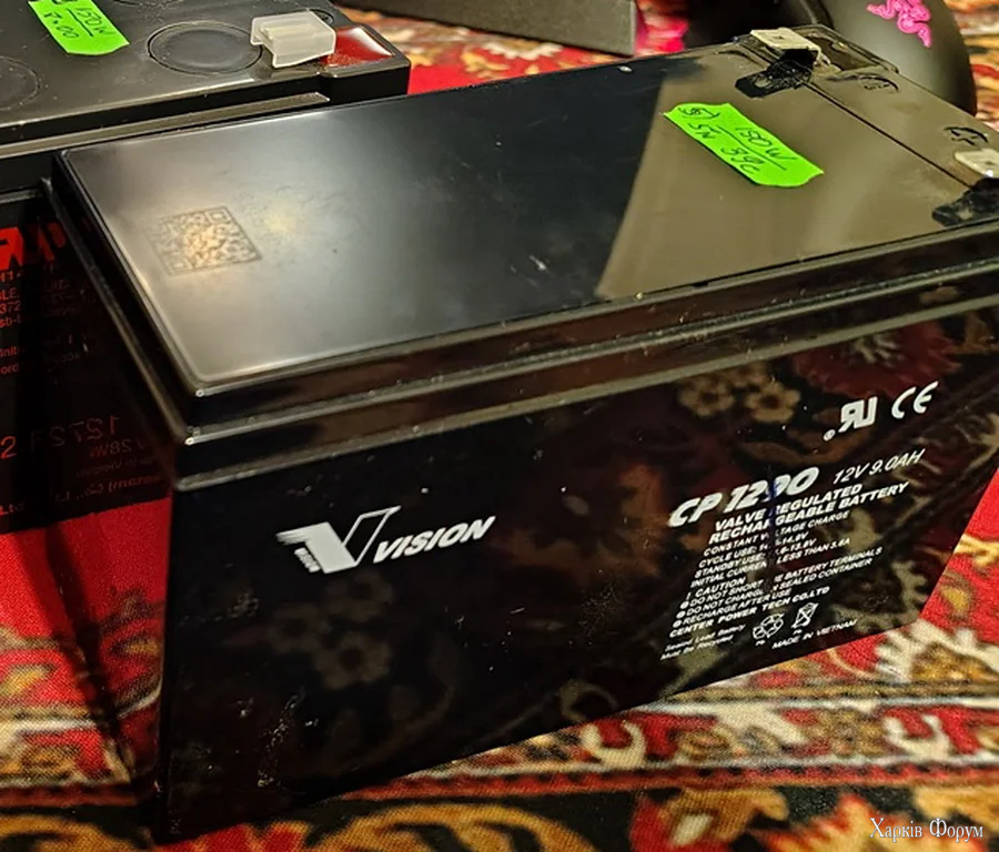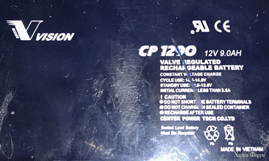Акумулятор Vision CP 1290 12V/9Ah для безперебійного блока живлення (UPS). Вживаніий. Знятий з працюючого ББЖ по регламентній заміні. Протестований з постійним навантаженням 150W: тримає - 5 хв. 39 сек. Вага 2,5 кг.