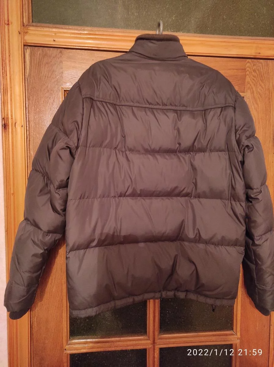 Пуховик в идеальном состоянии, наполнение (пух/перо) наружу не вылазит. Имеет два кармана на кнопке спереди и один карман на кнопке внутри, внизу затяжка.