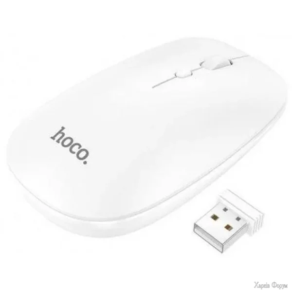 Hoco GM15 Art dual-mode - це технологічний аксесуар, який привертає увагу вишуканим дизайном, виділяється невеликою товщиною та вагою, що дозволяє носити його, наприклад, у сумці разом з ноутбуком. Пристрій має приємну на дотик поверхню, виконано в ергономічній симетричній формі, тому може комфортно використовуватися і правою, і лівою рукою. Під знімною верхньою панеллю його міцного корпусу знаходиться роз'єм для батарейки типу АА і слот з USB адаптером, призначеним для встановлення бездротового зв'язку з комп'ютером на частоті 2.4Гц. До того ж, мишка підтримує двоканальне підключення через Bluetooth V3.0 та V5.0, що визначає її сумісність із настільними комп'ютерами, ноутбуками, більшістю моделей планшетів та смартфонів. Аксесуар оснащений кнопкою для вибору чутливості сенсора (800, 1200 або 1600DPI), двома стандартними кнопками та коліщатком, ресурс натискань та прокручування яких становить 3 мільйони та 300000 разів відповідно, що гарантує його тривалий термін служби