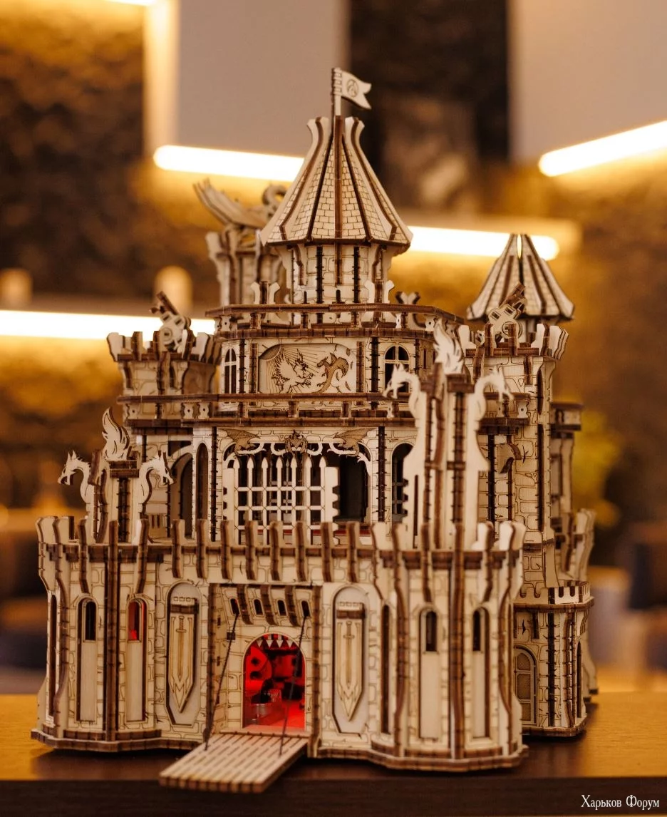 Собранная, полностью действующая модель механического замка из дерева, с подсветкой, музыкой и вращающимися башнями, ворота открываются. Модель Замок Дракона / Dragon Castle от Wood Trick.