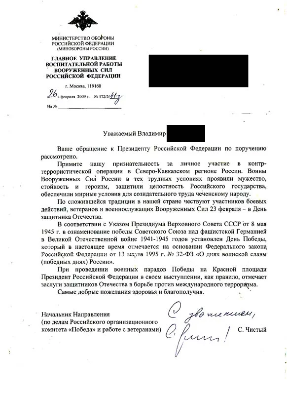 У меня думаю намного больше оснований отмечать этот день. Я в свое время даже обращался к путину, с вопросом. Почему ветеранов боевых действий он не поздравляет 9 мая. Прислали ответ.