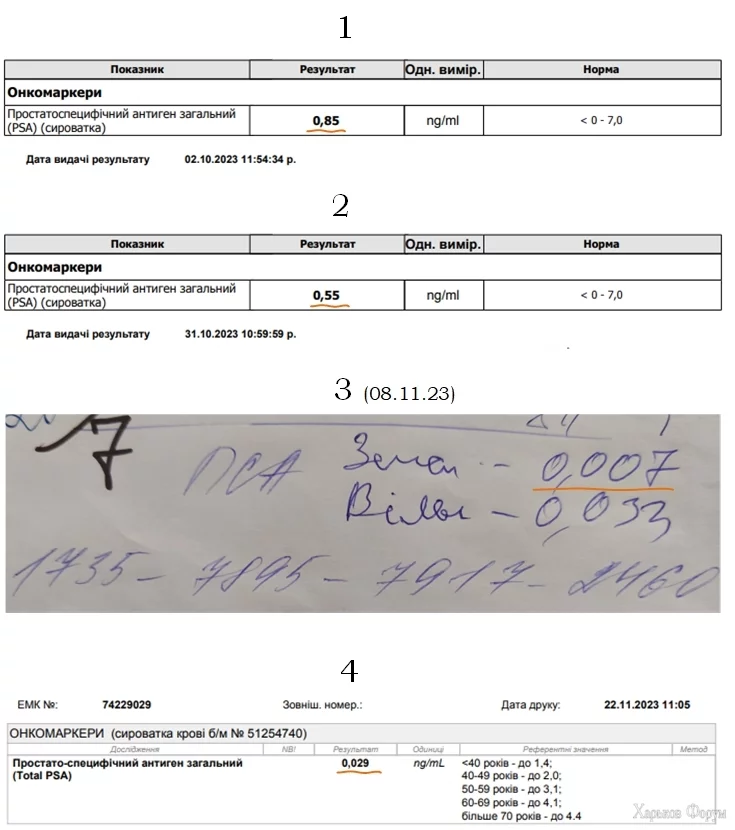 - Специально разместил результаты 4-х анализов ПСА (общ.) на одном фото – всем, кому эта проблема знакома и интересна будет легче сравнить и сделать свои выводы. На всякий случай пока не буду называть клиник – в другой публикации мне уже высказывали претензии (одновременно намекая на рекламу и антирекламу).
