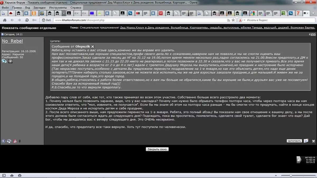 они нам сами перезвонили за 2 месяца до нового года и предложили услуги деда мороза, и дали возможность даже выбрать время. договорились на 31 декабря на 8 вечера. за 2 недели до прихода перезвонили и сказали, что дед мороз деткам грамоты напишет и попросили нас чуть перенести время на 21.50, согласились... и вот новый год..... ждем, проходит 20 минут, никого, звоним---молчат, трубку не берут. дозвонились через 30 минут - дед мороз говорит, будем у вас не раньше чем через час, и спустя 10 минут звонит снегурочка и говорит -мы к вам не успеваем, мы рядом, но не прийдем, можем прийти завтра!!!!!и это при том, что дети стояли под дверью и все это время ждали, и при том что по нашей рекомендации они получили еще 3 заказа! конечно мы отказались и поехали на площадь свободы, где дети увидели деда мороза и получили от него свои подарки.