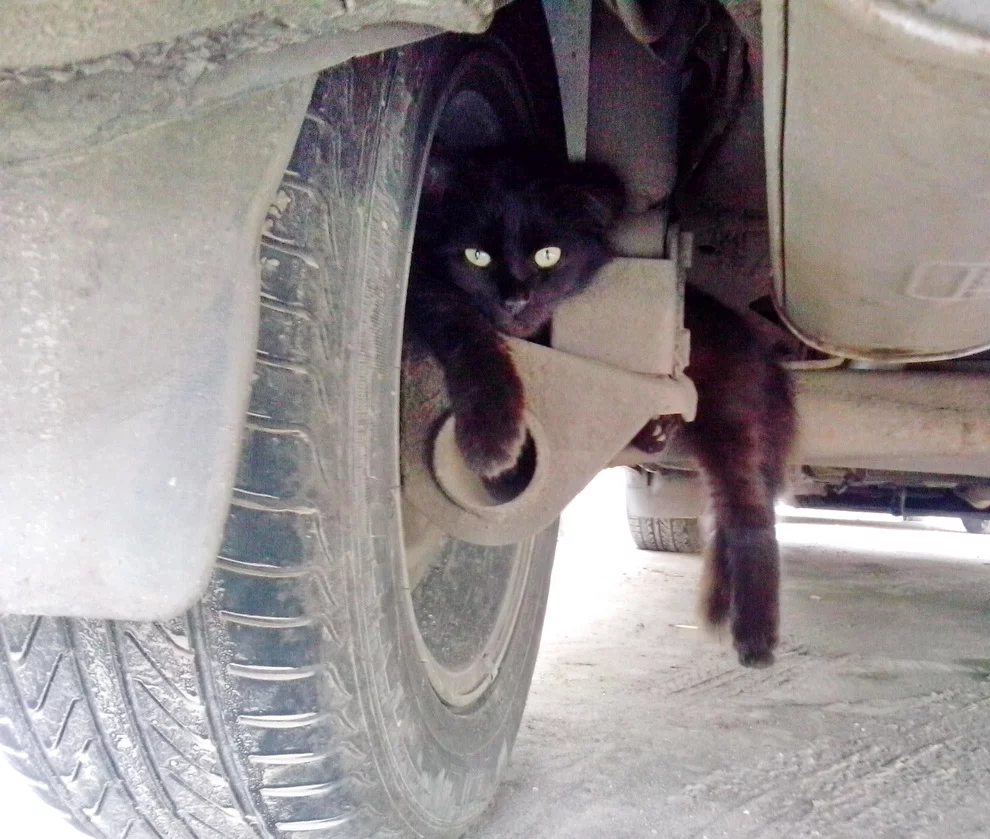 Подхожу к машине. Смотрю издали, тёмная хня висит возле колеса. Ну думаю капец, оторвалось что-то. Наклоняюсь...