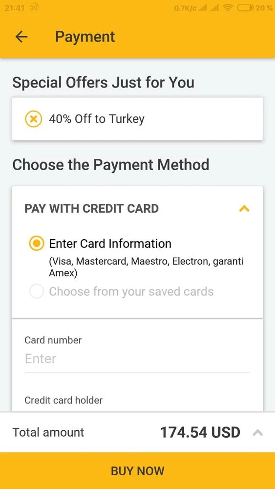 Ціну зі знижкою ви побачите на сторінці оплати, на перших етапах обирайте квитки зі стандартною ціною, яка після знижки буде значно меншою. Клікніть на напис 40% чи 50% Off to Turkey, щоб увімкнути знижку.