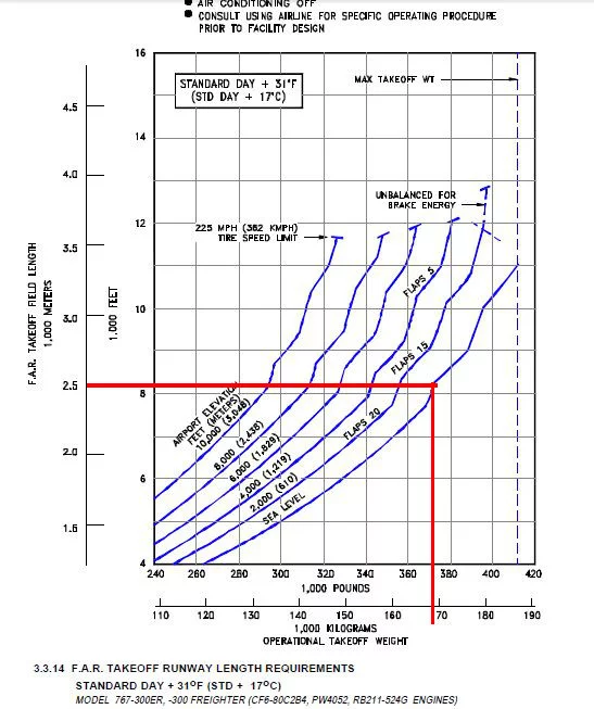 потребную взлетную можно посмотреть в мануалах, и увидим график вроде этого, красным отметил имеющуюся у нас полосу, внизу можно глянуть с какими весами можно улетать (при увеличении температуры взлетная масса будет еще уменьшатся)