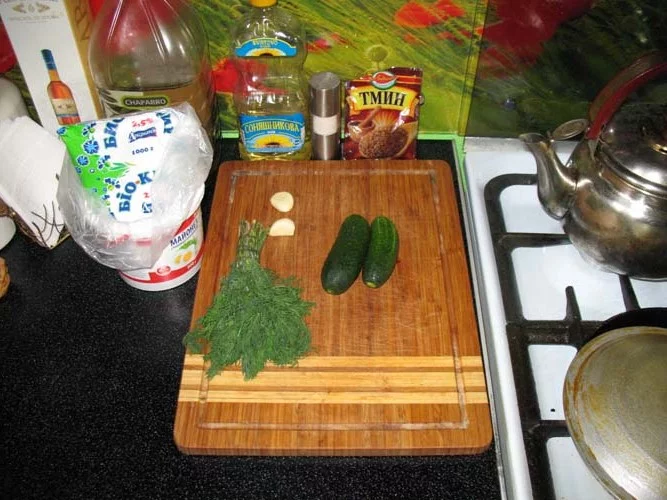1. Нам понадобятся огурчики, чесночек, укропчик, соль, тмин, рафинированное подсолнечное масло, вода.