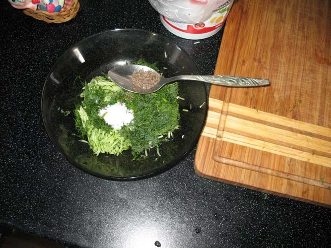 5. Мелко режем листики укропа, добавляем к тертому чесноку с огурцом, туда же щепотку соли по вкусу, немного тмина, можно добавить для запаха чуть-чуть фенхеля. Перемешиваем все это дело, чтобы огурец с чесноком пустили сок.