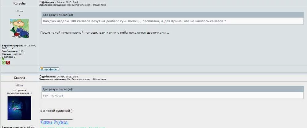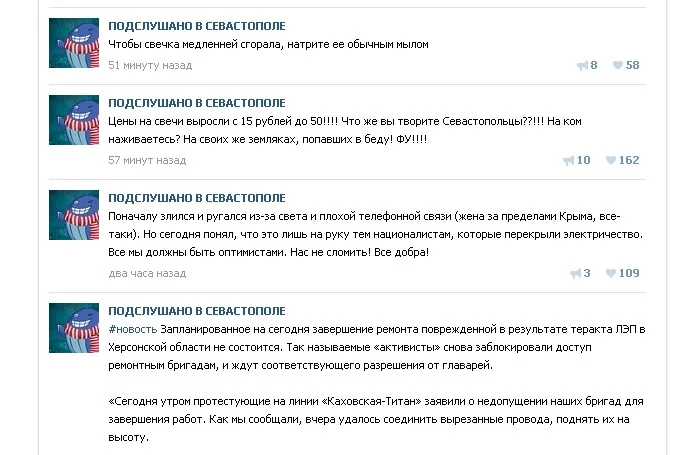 есть у меня знакомый в РФ, у него родня в Севасе. Ну не близкая, так... Короче, он обычно новостей русских с истериками насмотрится и потом интересуется, что там к чему у нас (или в Крыму, бо у нас тоже там есть знакомые). А тут такие события, а он ни слова... Короче, в новостях же им глубину жопы не показывают - типа, все ок, свет ненадолго отключаются, скоро починим, а тут мы спросили, что там его родня - т.к. со своими мы с начала энергоблокады не можем связаться, так он аж прозрел. Связался со своими - говорят там настоящая ****.