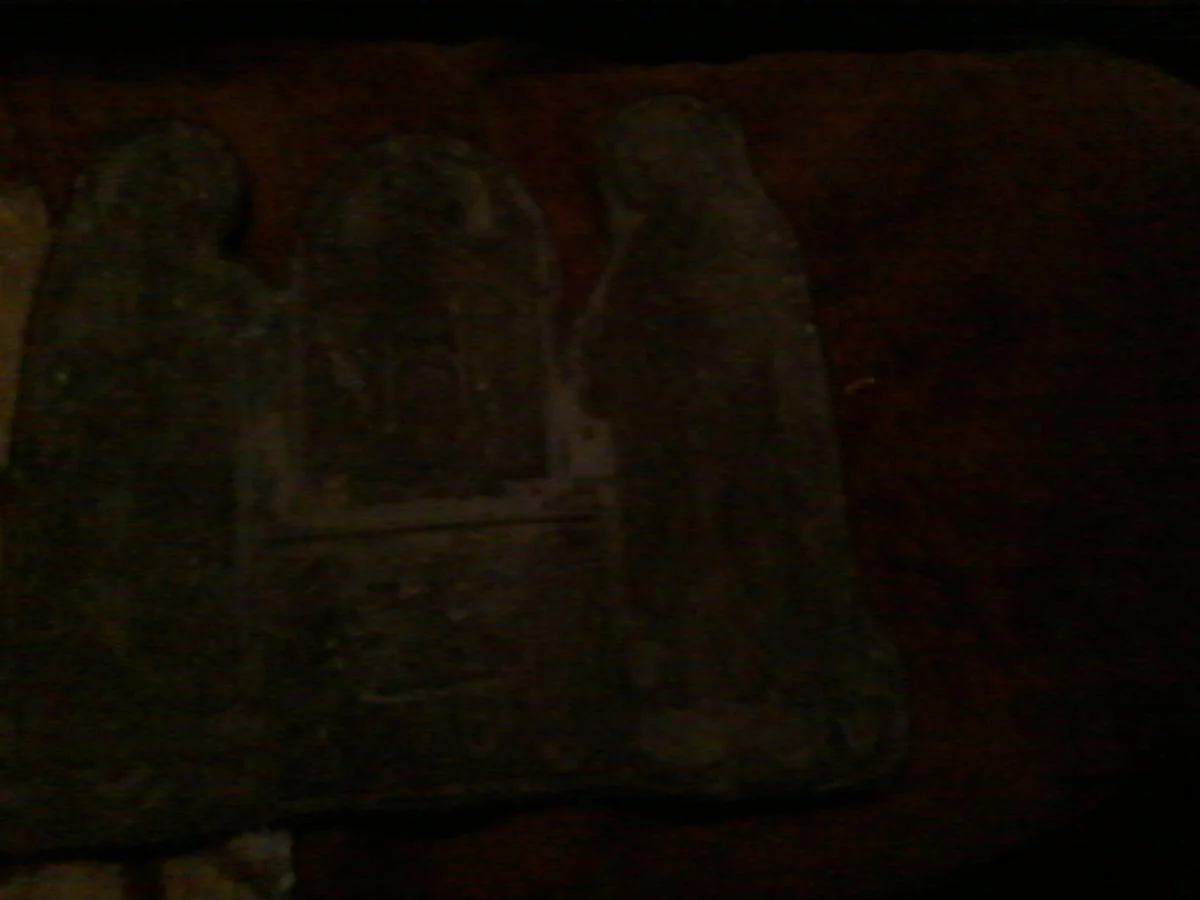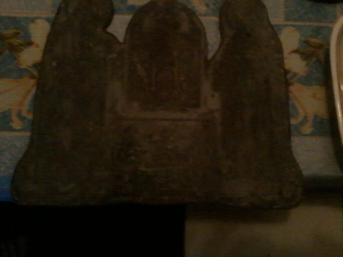 Была я недавно в гостях и вот показали интересную штуку. На вид это пластина из меди или латуни, размер, примерно, 25на35см, толщина около 2мм. На пластине две иконы (одна из них, нижняя, точно Успение), по бокам, во весь рост, изображение двух святых (думаю, это Антоний и Феодосий Печерские), посередине зеркальная надпись (примерно 10слов), что написано не смогла разобрать, даже когда поднесла к зеркалу ( сильно окислилось всё