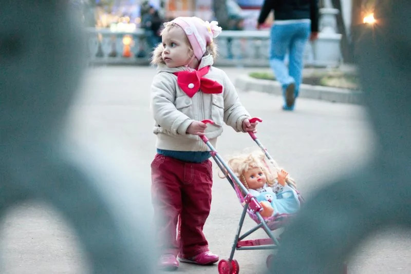 Прикольная фотка! Только кадрирование не сильно нравится;) А я вчера видел психоделическую картину:) (извиняйте за качество-снято с рук Юпитером37---мало того, что бесконечность после 20 метров то есть, то нет-так еще и темно было :) ) У девочки с коляской есть еще РОЗОВЫЙ мяч. А еще двух девочек в розовом минут за пять до съемки мамы забрали домой...