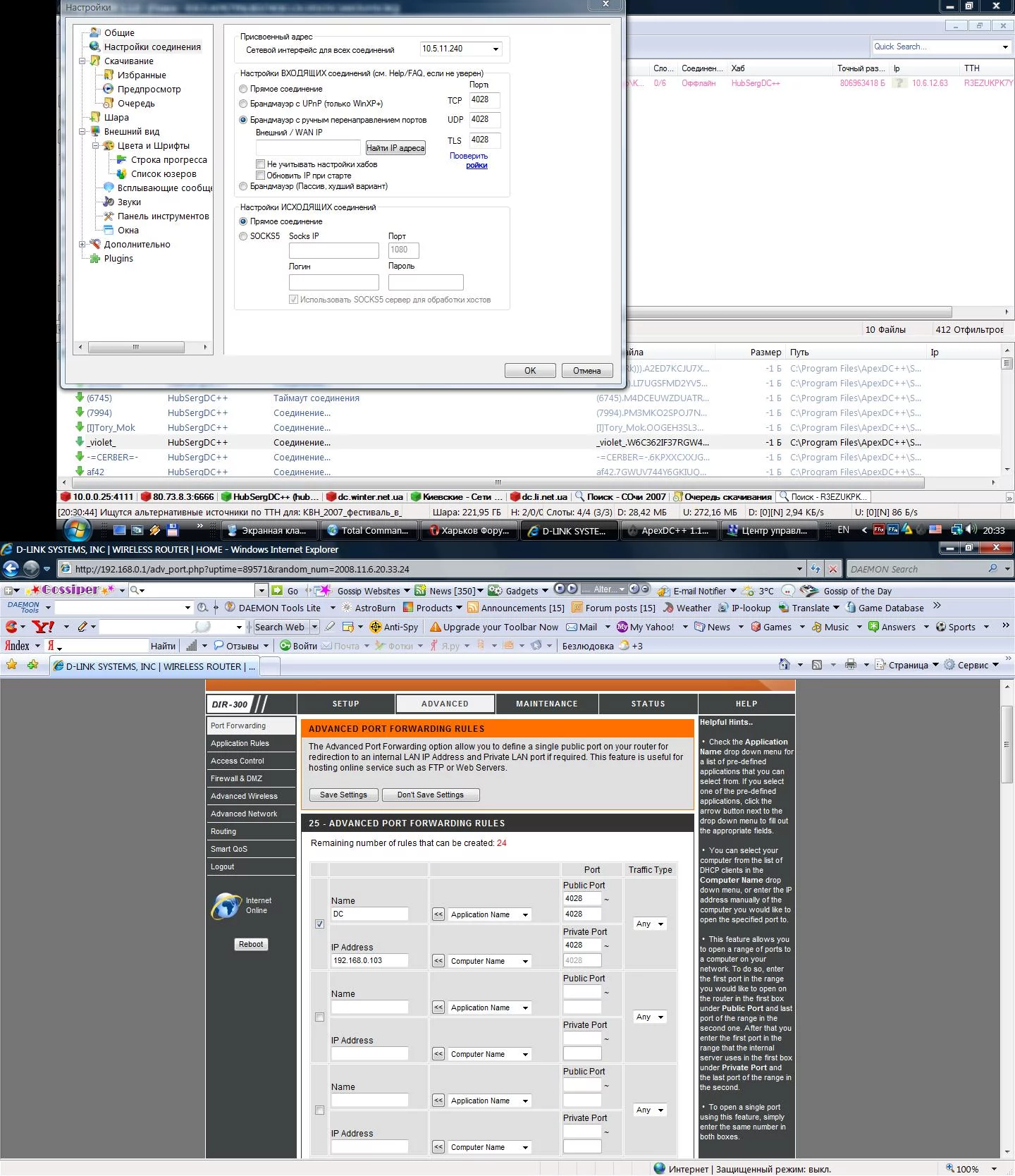 Поставил себе маршрутизатор, промучился с пол дня, сетку и инет настроил, а вот с dc проблем - кой как работает тока в пассивном режиме... читал здесь Посилання видалено , но так и не допер чего куда вписывать...
