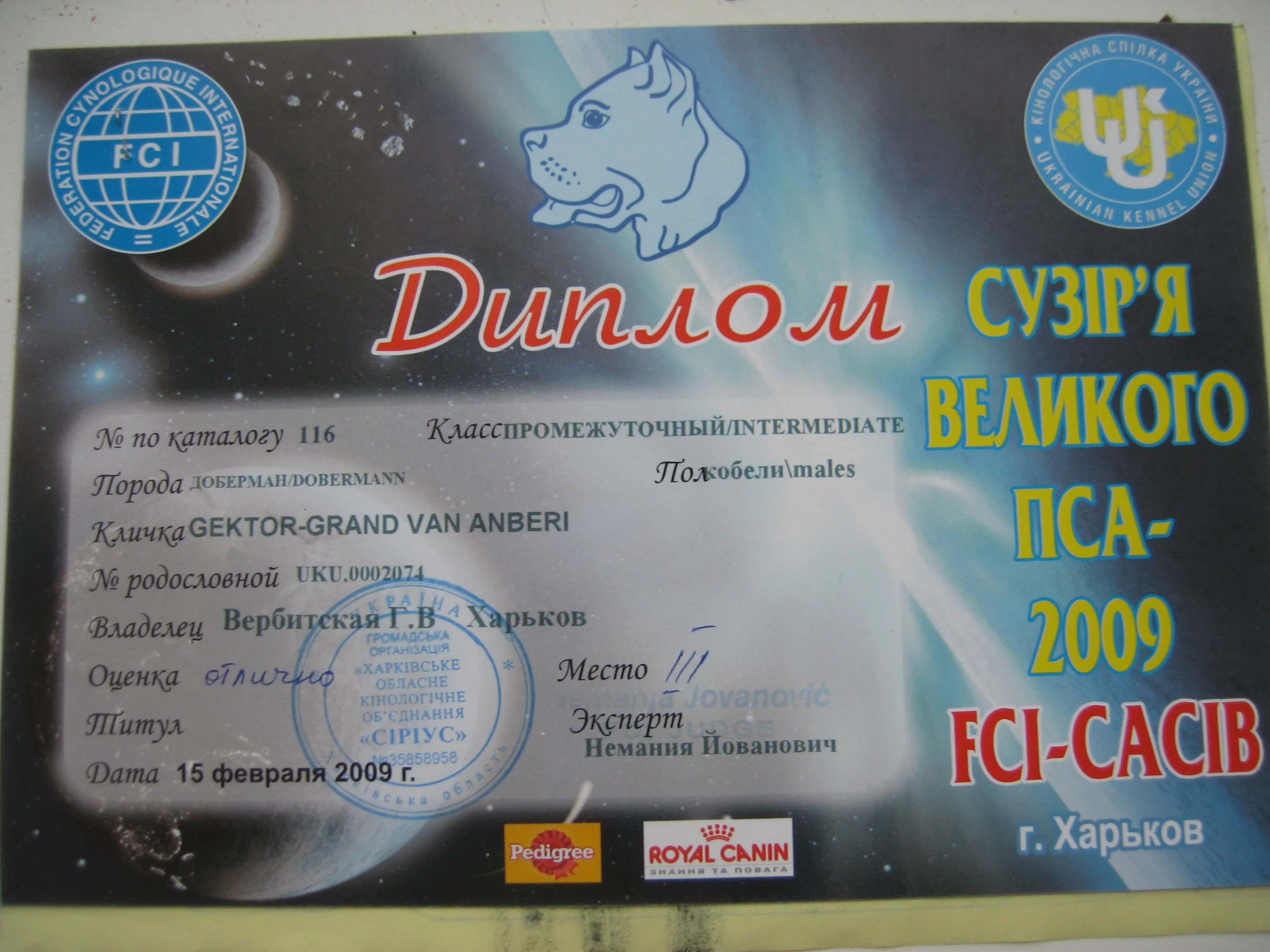 По поводу Купидона Креола вот копия нашего диплома, он точно такой-же. Видно в ринге работали профи, поэтому в ринговой ведомости у Креола и Гранда стоит только отлично вообще без расстановки(я узнавала). А вот в ринге Креол стоял за Грандом при расстановке.