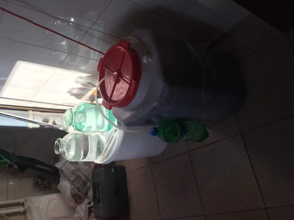 Купил бочку на 60 л, залил 40 л воды, добавил 15 кг сахара, замешал, засыпал мезгу винограда, долил воды, установил гидрозатвор и в термокомнату занес. Опять же без дрожжей. Всплывшую мезгу планирую перемешивать ежедневно.