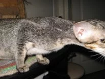 На фото - нарывы в ухе, а на шее шрам от лопнувшего воспалённого лимфатического узла, а не термический ожог, как сказала нам заводчица, а на другом сайте, где мы подняли этот вопрос - она сказала, что это разодрала её кошка-мама.