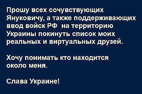 а у меня все с точностью до наоборот, друзья остались друзьями ибо нужно элементарно уважать чужие взгляды, можно конструктивно поспорить но не погружатся в идеотизм, ибо политика политикои а друзба дружбои, а если вы ***** друзеи посылаете только за их взгдяды которые не совпадают с вашими так извините как вас назвать??вы как минимум явно небыли для этих людей другом никогда!!! им стоит задуматся, вот например мои двоюродный брат тоже радикально не разделяет моих взглядов, мы можем долго спорить, в чемто он соглашается со мнои в чемто я с ним, в результате мы приходим к единым решениям и выводам находясь по разные стороны баррикад но никакои ненависти, вражды, и тем более посылания ***** никому и в голову не приходило, и это не единичный случаи, более того те кто был просто знакомыми стали друзьями причем и с противоположнеым мнением......а с таким подходом только разжигать ненависть друг у другу, это глупо, краине глупо.....