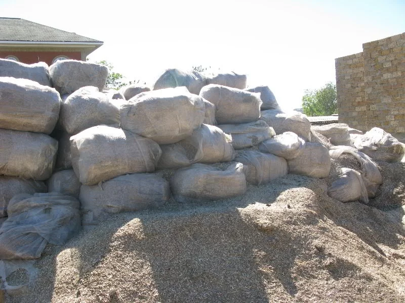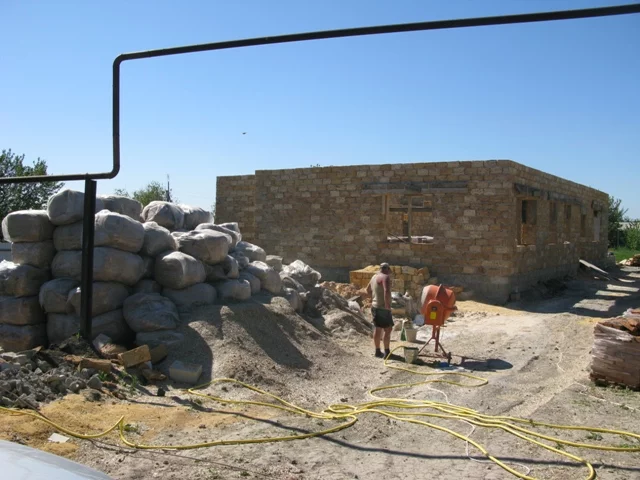 В мешках - костра конопли. Костробетон в бетономешалке. И пирог стены: ракушка-костра-ракушка.