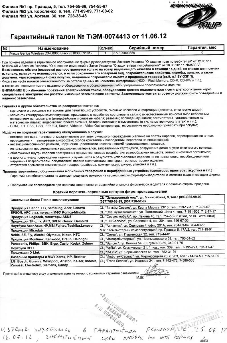 С этим актом я направился снова в сервисный центр магазина, там мне сказали, что они должны его проверить, после чего вернут деньги или заменят аппарат (там мне выдали квитанцию №9444). Несмотря на то, что по закону такая «проверка» должна проходить не более чем 7 дней, ничего они мне сказать не могли две недели, а потом заявили, что компания HTC не считает такие акты поводом для списания. Поэтому они направили телефон на ремонт в другой сервисный центр, где его все не могут отремонтировать.
