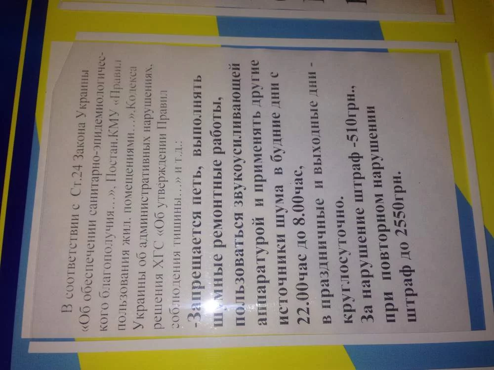 Сегодня обнаружили на доске объявлений в доме такую табличку.. Будут штрафовать за шум с 10 вечера до 8 утра. И вот сразу вопрос, а строителей как штрафовать будем ? Каждому штраф или на бригаду??? Первое предупреждение 510 грн, и к кому обращаться??? Кто следит за порядком в это время?