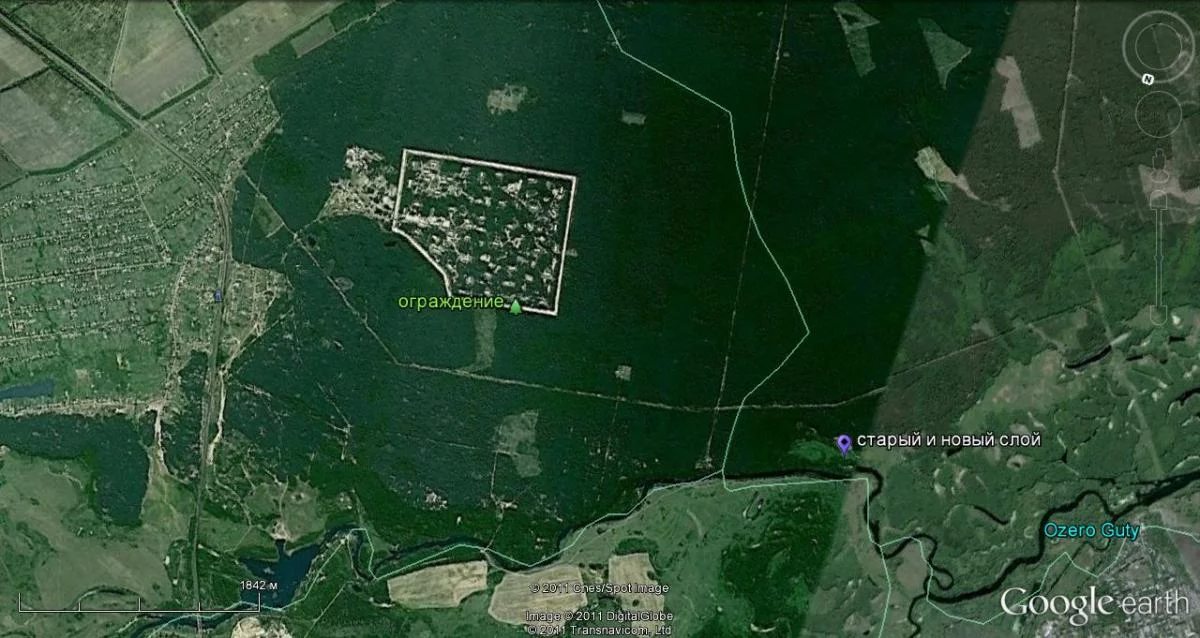 В действительности в "гугле" этот объект, а точнее квадрат, где он находится размыт и это не случайно. На снимке по периметру виден только белый контур забора (5 км). В действительности там пять рядов колючей проволоки, расстояние межу рядами 5-8 метров, но этого на карте вы не увидите. Схожая ситуация по другим стратегическим объектам и воин. частям, в частности по Белг. шоссе (Лесное) тоже "сбита резкость". Вероятно существует негласное соглашение по этому поводу, "впрочем это уже другая история"