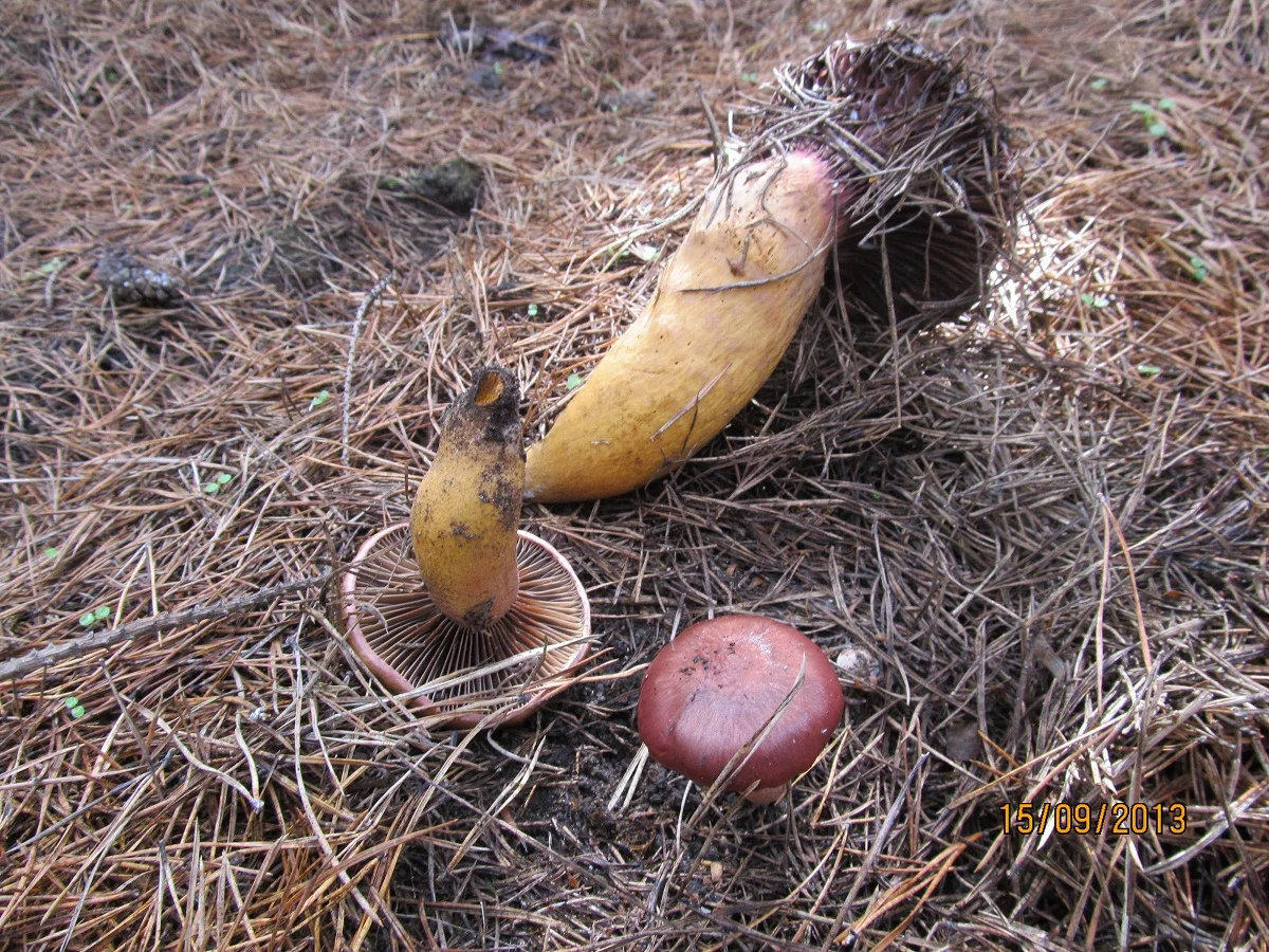 Подскажите, пожалуйста, что это за гриб? Нашли в сосняке, в разрезе пластинчатый.