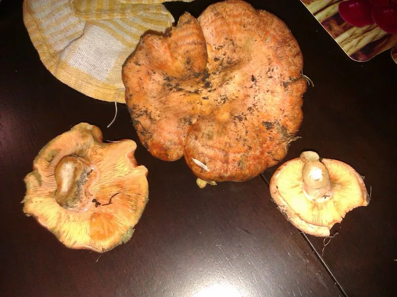 Друже, я не силён по грибам в лиственном лесу, но рыжики - это моя грибная специализация:). Поэтому легко могу поставить 1000$, против твоих 100$, на то что это именно рыжик;). Оранжевый сок на срезе, выделяет свежий гриб, а дальше в зависимости от многих факторов (температура воздуха, влажность, состояние самого гриба и т.п.) срез либо остается слегка оранжевым, либо бледнеет (как на фото), либо вообще зеленеет. Да и место и время сбора, тоже накладывает отпечаток на внешний вид гриба- ранние, собранные в траве, более блеклые, чем более поздний, собраный на хвое и под валежником. А если по почве были заморозки, то вообще бывает что даже свежий рыжик сока недает, а то и просто меняяет окрас с рыжего на зелёный...