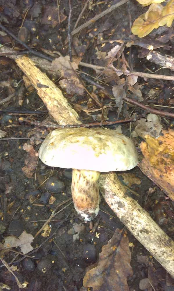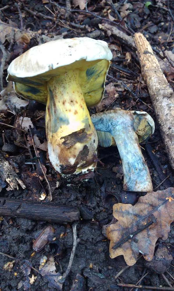 2. Шляпка светлая, оливковая, на срезе синеет, есть красные пятна.