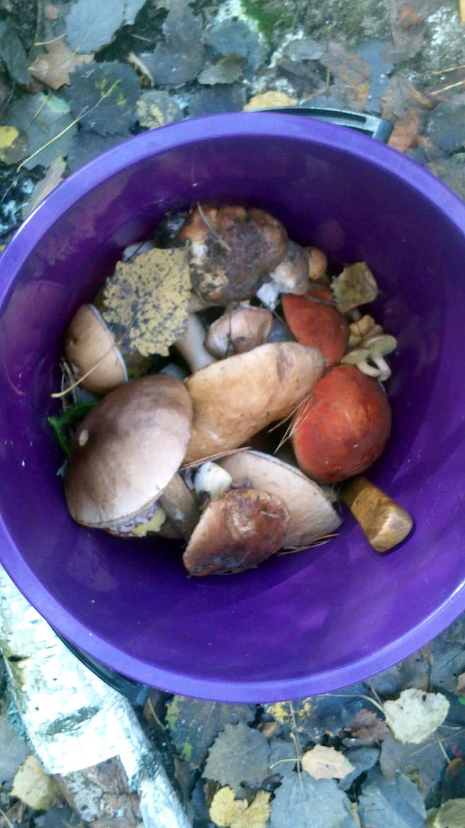 сегодня - подберезовики и подосиновики (начали расти активно, есть молодые), немного маслят (остатки предыдущей волны, маленьких нет) и козлят, один большой белый гриб, слегка погрызенный мышами ))