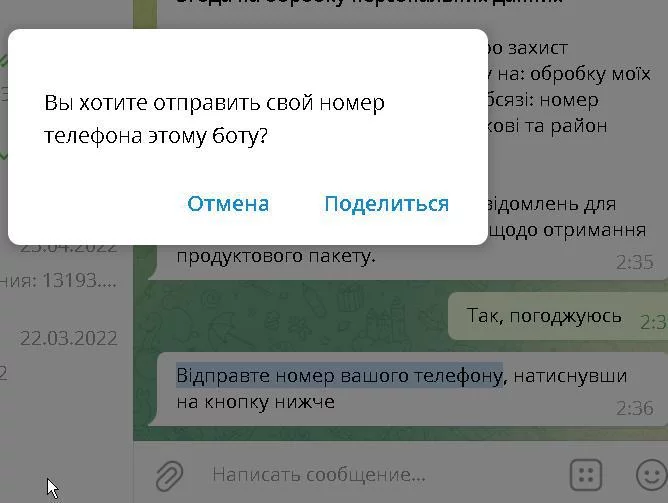 Я понимаю о чем вы говорите, надеюсь мы все вместе помогли человеку зарегистрировать его маму в телеграм, добавить в ее аккаунт чат-бот про гуманитарную помощь и сделать там новую заявку на ее номер телефона.У вас ДВА аккаунта на ДВЕ симки зареганые, но на ОДНОМ приложении, установленом на ОДНОМ *****ьникемобильном телефоне. Простите, но я не могу по другому называть данное устройство)) Аккаунт телеги можно и третий установить. сейчас выложу скрин