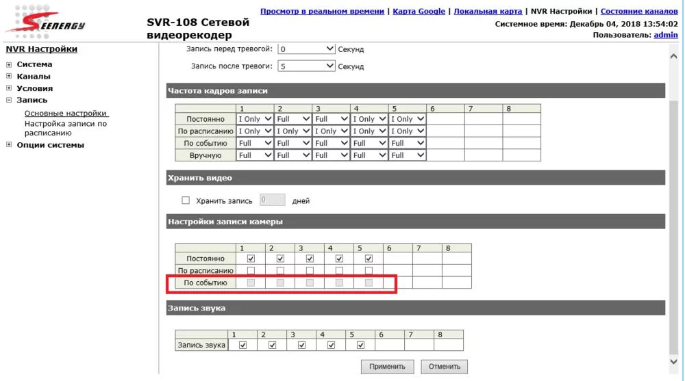 Достался сетевой IP-видеорегистратор seenergy svr-108, ищу любую инфу по данному сабжу. Нужна максимально последняя прошивка, сейчас Версия прошивки: 1.7.12.30054084 . И пара советов в настройке, в частности не могу понять как включить запись по событию, либо не там смотрю, либо чего то не понимаю, на регистраторе хиквижин настраивается легко,а здесь немного подзастрял, данная опция не активна.