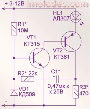 Не заработала. После шаманства (на сколько хватило познаний в электронике) транзистор VT2 был заменен на KT361 - ЗАРАБОТАЛО. Поставил КТ3107 - работает, КТ209 - работает. Ставлю BC857 (другой) не работает. Пробовал SMD транзисторы BC808, BC856, BC860 - не работает. Во всех случаях диод зажигается, через промежуток времени, после подачи питания и остается гореть. В случае советских транзисторов все работает прекрасно. Чего не хватает этим импортным SMD? Может кто подскажет где подрегулировать?