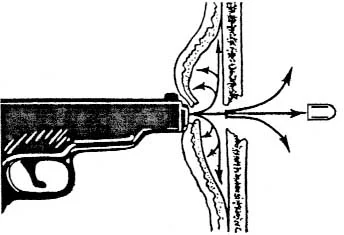 Выстрел в упор ( в тело или одежду) значительно уменьшают звук выстрела вследствие гашения высокого давления выбрасываемых дульных газов, создающих основную звуковую волну. При выстреле в упор разрушающее действие газов проявляется как в области входного отверстия, так и в глубине раневого канала, иногда вплоть до выходного отверстия. Чтобы было понятней, приведу картинку: