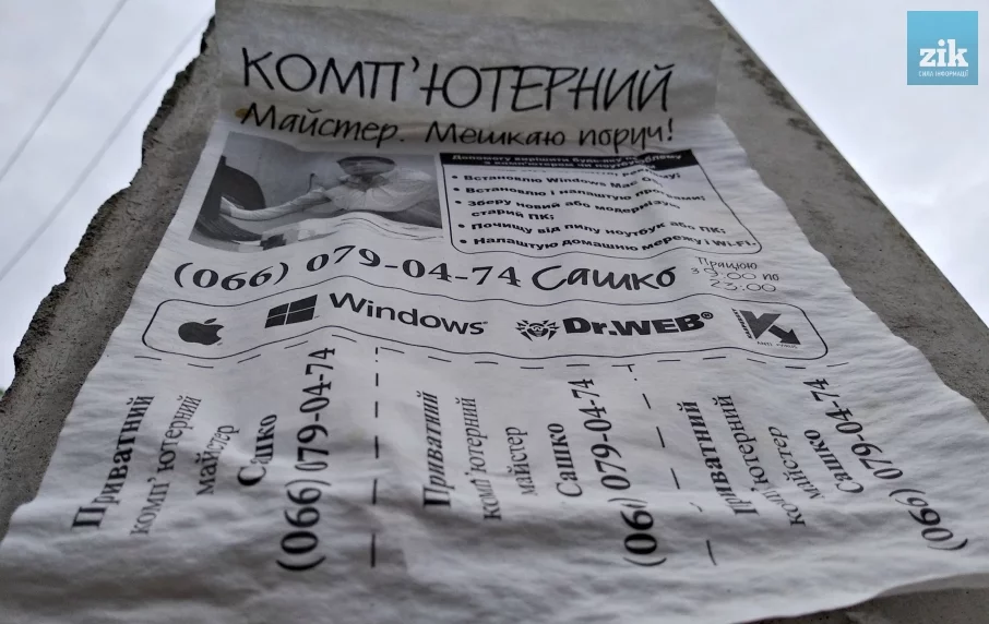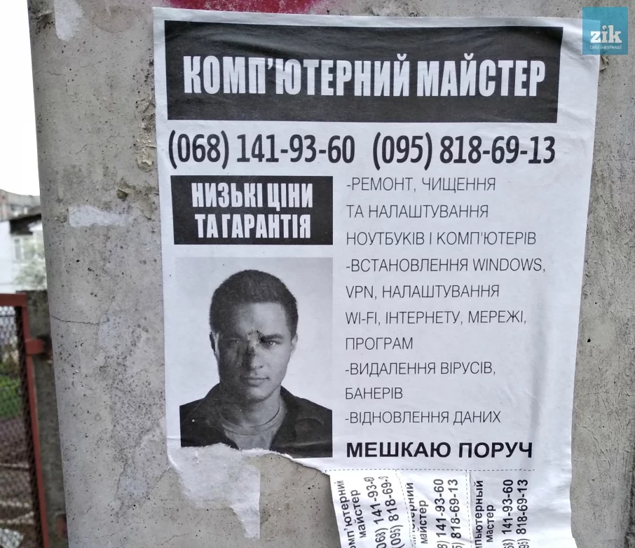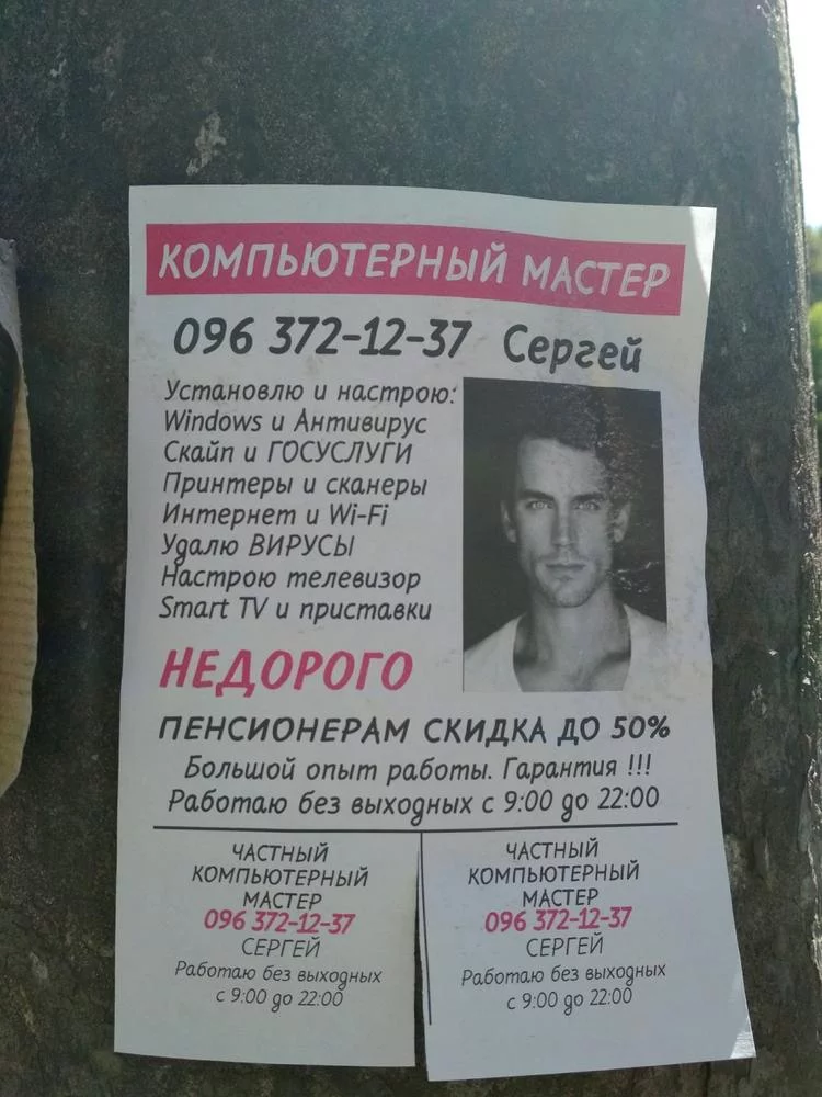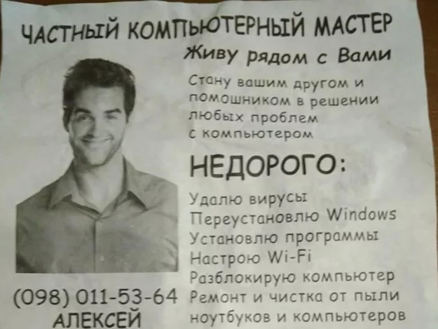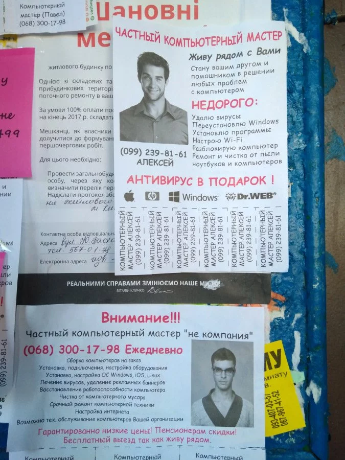 Во многих городах Украины, в частности во Львове, на домах, в подъездах и заборах крупных жилых массивов часто можно встретить рекламу типа: «Стану вашим другом и помощником в решении любых проблем с компьютером. Живу рядом с вами! Звоните с 9:00 по 24:00. Без выходных». И тому подобное. Чтобы привлекать внимание, на таких бумажных объявлениях изображены красивые голливудские актеры, и кратко говорится о том, что цены невысокие, а для пенсионеров – скидки и, вообще, антивирус в подарок. Однако, правда в том, что практически во всех случаях – это обычное мошенничество, ноги которого растут из России.
