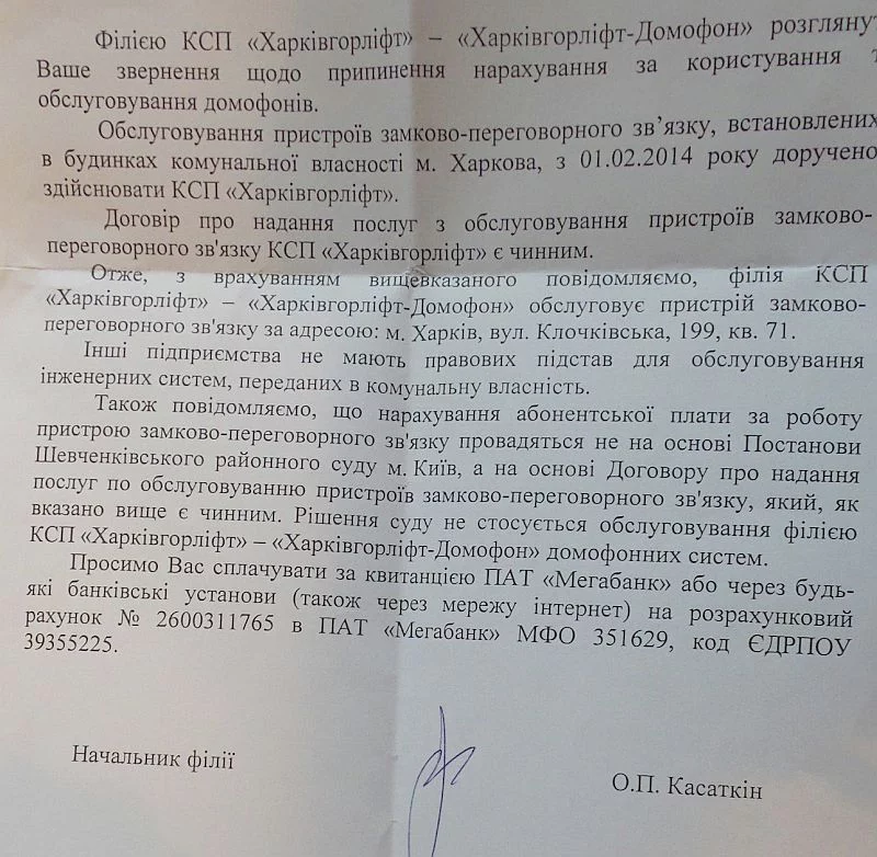 У меня обслуживает КС-Инвест, плачу им. Ситуация та же самая, кому платить? Позвонила в кс инвест, сказали, что есть решение суда, платите нам. А горлифту пишите письмо о снятии начислений. И держреестра судовых ришень взяла все выписки решений, что суд им отказал, что апеляцию отклонил в 15 году и решение обжалованию не подлежит. Написала, мол, снимите начисления. ответ пришлите по почте. Сегодня прислали ответ. Сижу смотрю на эту ******ь и думаю, что делать дальше. Договора у меня с горлифтом нет. Что посоветуете? Подавать в суд на горлифт или расторгать договор?
