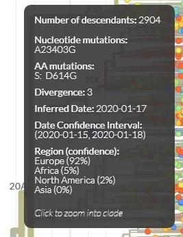 Идем на nextstrain.org смотрим филогенетическое дерево вируса. Видим, что ветвь 20А характеризуется мутацией D614G, возникшей по мнению nextstrain-а в середине января.