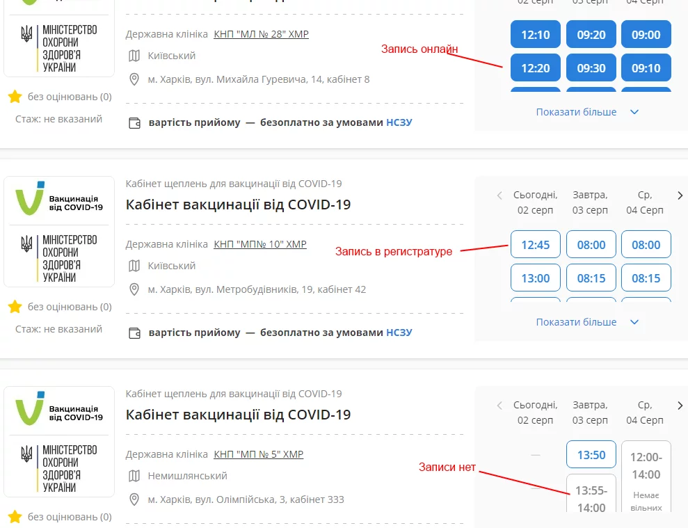 2. Белые с синим ободком и синими цифрами времени записи - это твой случай, клацая по ним получаешь окно, где говорится, что запись только в регистратуре