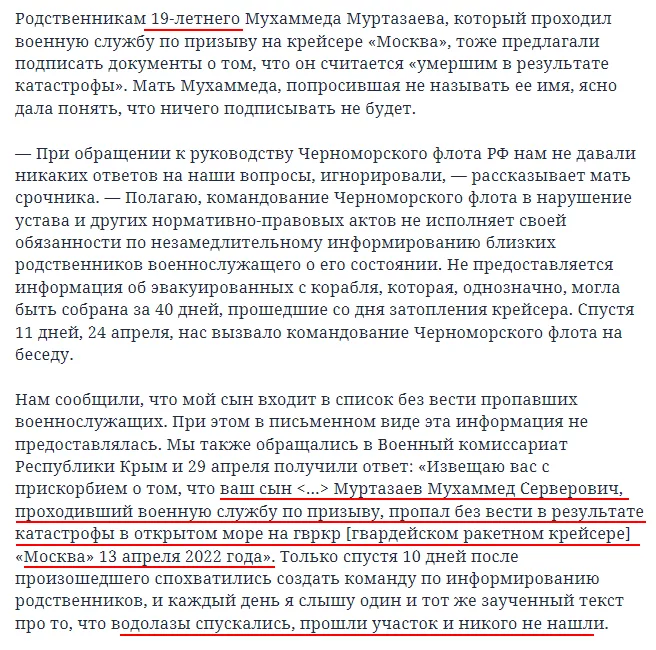19-летний срочник Мухаммед Серверович Муртазаев пропал без вести в результате катастрофы в открытом море на гвркр «Москва» 13/04/22, водолазы спускались, прошли участок и никого не нашли. Совсем пропал, да. В самоволку свалил.