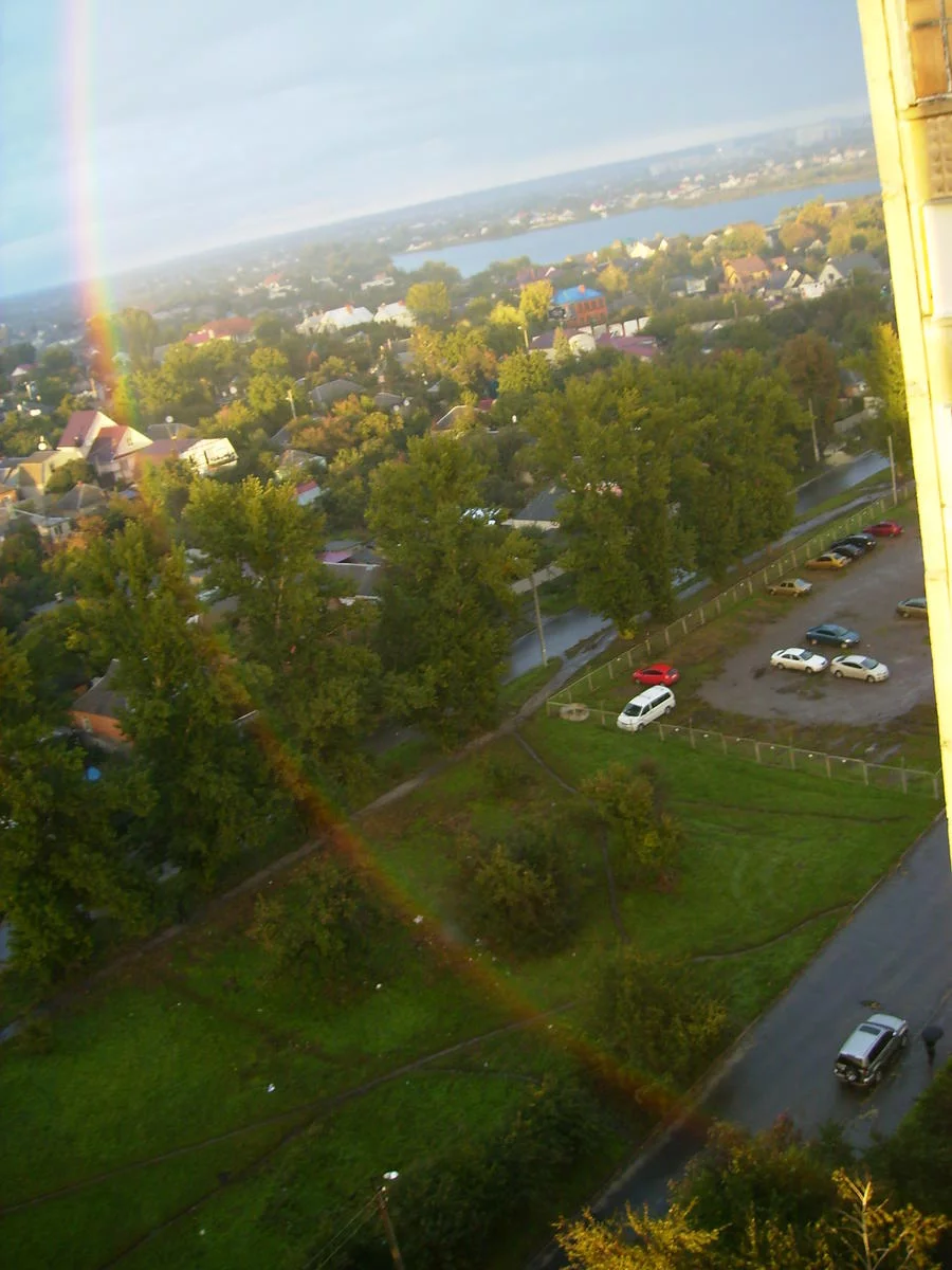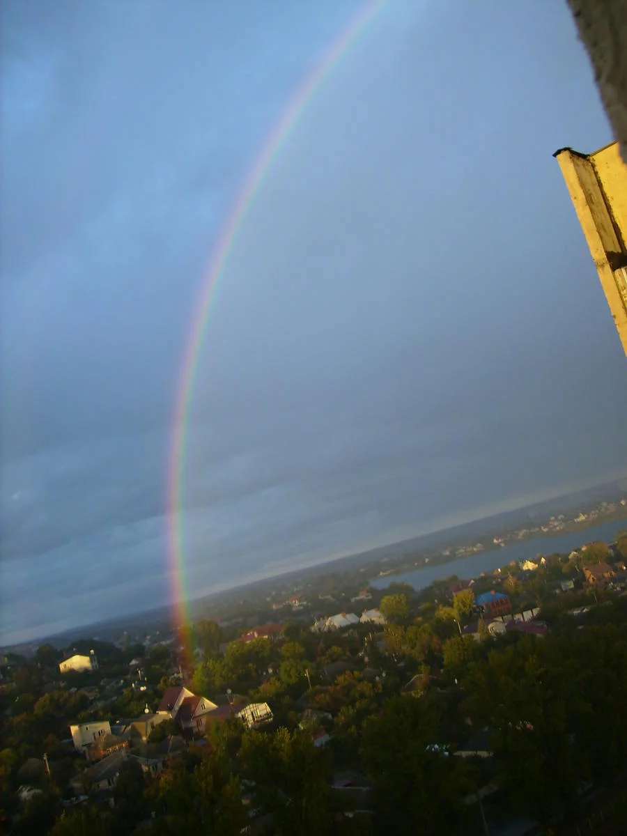 . Они проходили через радугу и, скорее всего, не видели её. Попыталась сфотографировать, но фотография не передаёт всю картинку, удалось сфоткать частично и то не слишком хорошего качества. Если Вы сложите эти 2 фотки вместе , то сможете увидеть полушарие радуги остальная часть - за домом.
