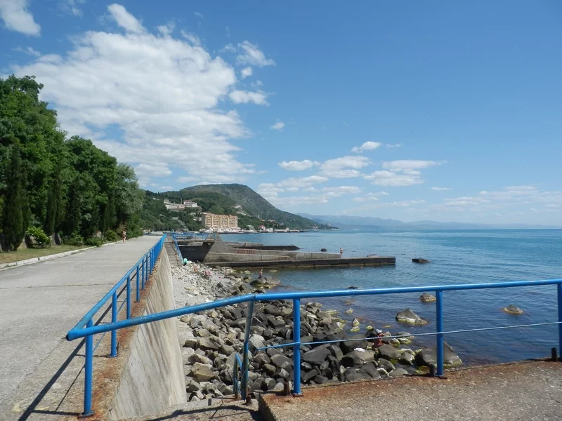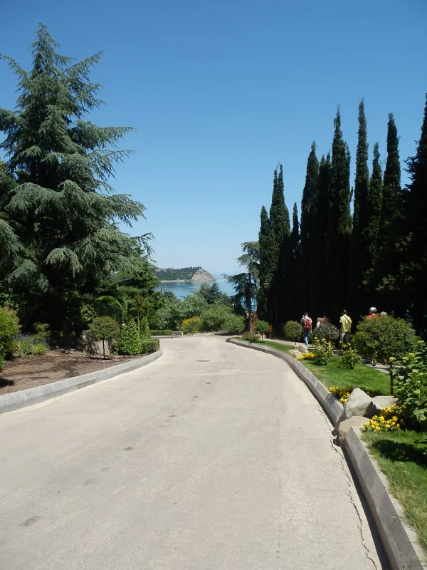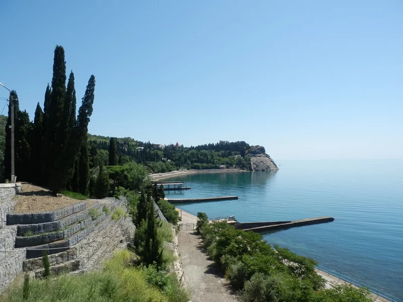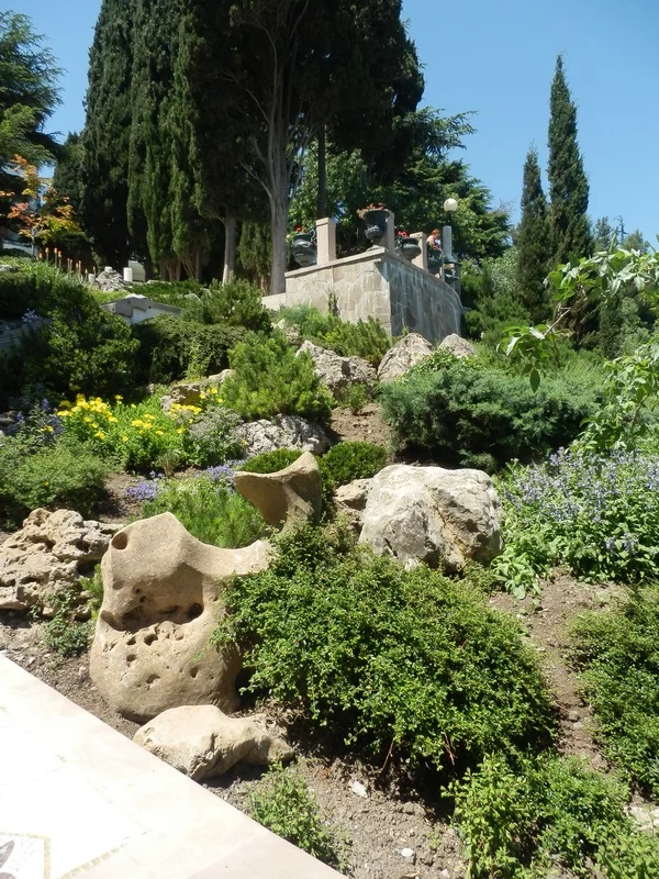 До Санта-Барбары 20 мин, до Утеса 10 мин подъем пешком по лестницам, на Утесе можно глянуть замок княжны Гагариной (сейчас админ корпус санатория), далее спуск через парк "Карасан" на набережную - 30 мин. Далее искупались и отдохнули на пляже. Далее потопали около 50мин в Партенит к Парку "Айвазовского".