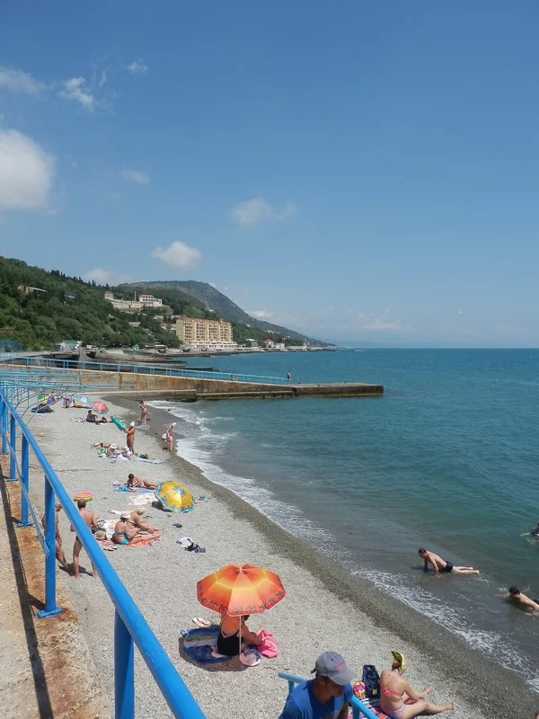 Погода оказалась не очень, то тучи то солнце. После Ялты Алушта на вид не очень, но все же. Накрапывал дождь, но на удивление пляж оказался забитым