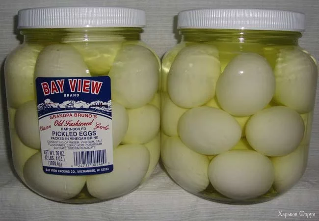 Коли дружина рік тому повернулася із США, то вона сказала що їй дуже сподобались дві прості але незвичні нам страви - мариновані яйця та жарені солоні огірки. Останне дійсно смачноЦе з анатомічного музею? На банці написано, що це яйця дідуся Бруно...Або він був мутант, або цих Бруно було декілька...![]()
