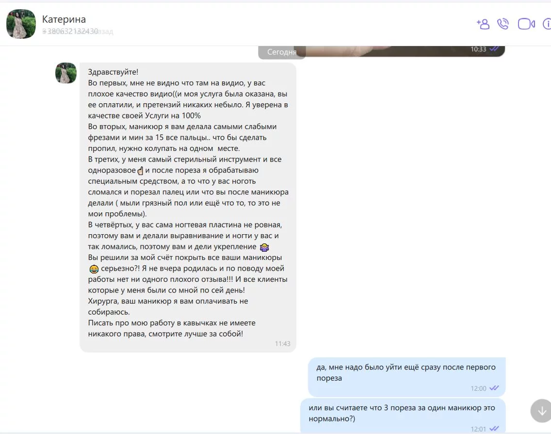 Катерина в ответ на мои претензии сказала, что работой своей довольна, порезы бывают при сухой кутикуле, деньги возвращать она мне не будет и компенсировать расходы на хирурга (при необходимости) тоже. Всё это было сказано некорректно, было заметно, что желания найти компромисс нет.