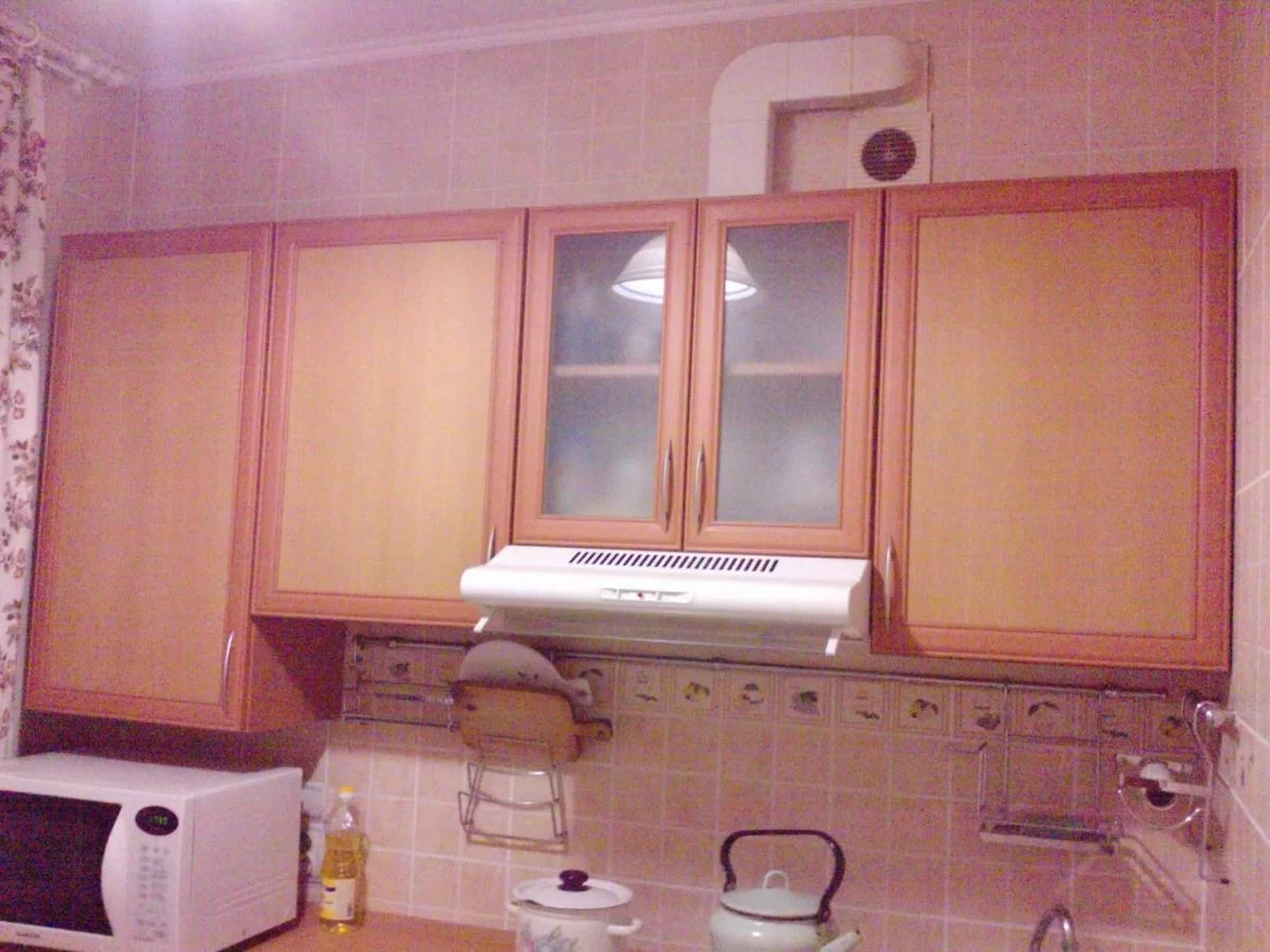 Мастер отказался прорезать полки над вытяжкой точно под пластиковую прямоугольную трубу, сказав что это очень долго и трудоемко и будет дорого стоить. У соседки вокруг круглой вытяжной трубы он сделал зазоры по несколько сантиметров, как я понимаю, вырезал с запасом, чтобы не ошибиться при установке вытяжки. Я же сделал зазор не больше 5мм.