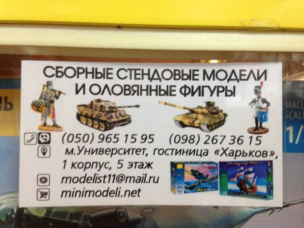 4. м. Холодная Гора, ул. Ильинская, 67, по этому адресу магазин НЕ РАБОТАЕТ, переехал на м. Ак. Павлова, ТЦ "Союз", подвальчик возле "Приватбанка" (большой быбор моделей 1/72, 1/87, 1/43, декали, аксессуары) - актуально,