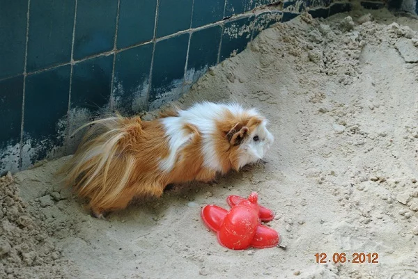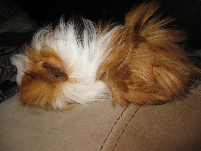 шерсть мягкая, но не как пух, у маленьких свинок у всех шерсть как пух, потом немного грубеет, дело возрастное. Наверно через полгодика тоже стрижки придется делать, сейчас пока нормально, единственное, вот эта привычка садиться в воду - потом достаешь из вольера, все пузо мокрое с лапами, приходится вытирать перед выпуском на диван.