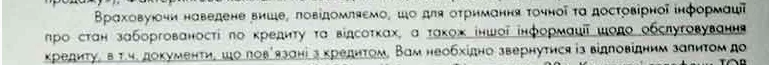 Я понял Ваше мнение с первого раза"Враховуючи наведене вище, повідомляємо, що для отримання точної та достовірної інформації про стан заборгованості по кредиту та відсотках, а також іншої інформації щодо обслуговування кредиту, в т.ч. документи, що пов'язані з кредитом, Вам необхідно звернутися із відповідним запитом до ..."