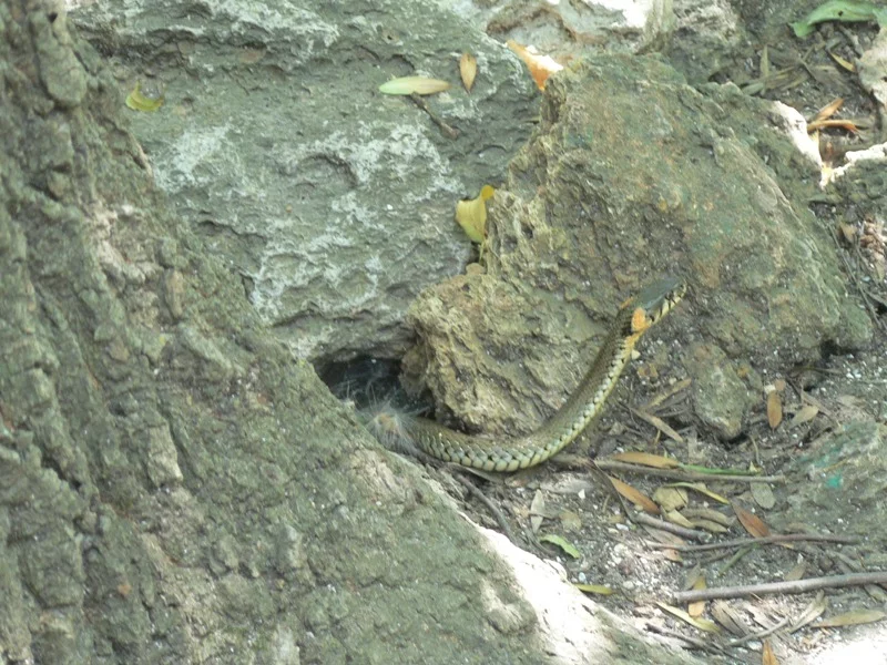 А под мостиком у ручья мы увидели настоящего ужа.