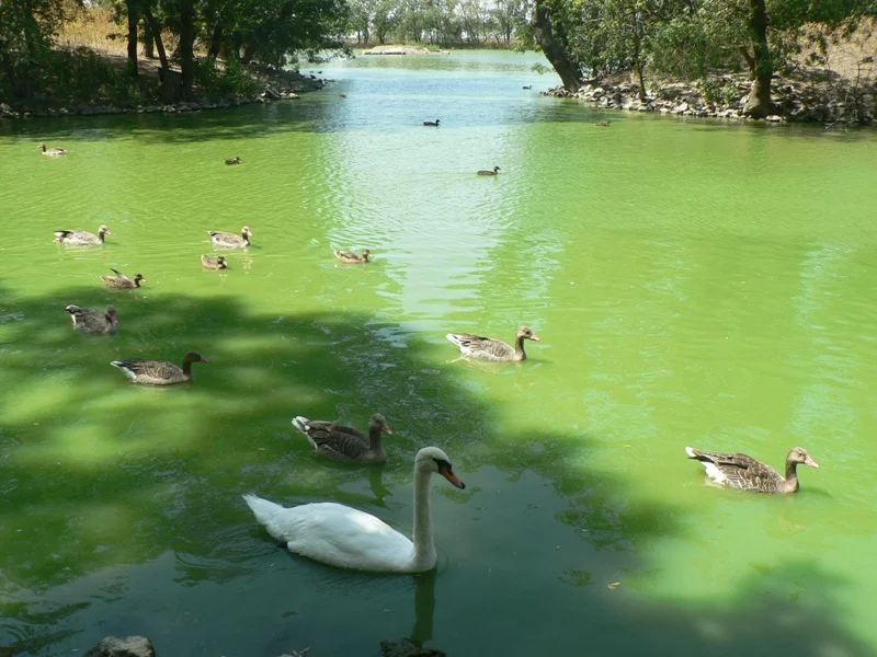 Имеется большой водоем, в котором плавает огромное количество самых различных птиц.