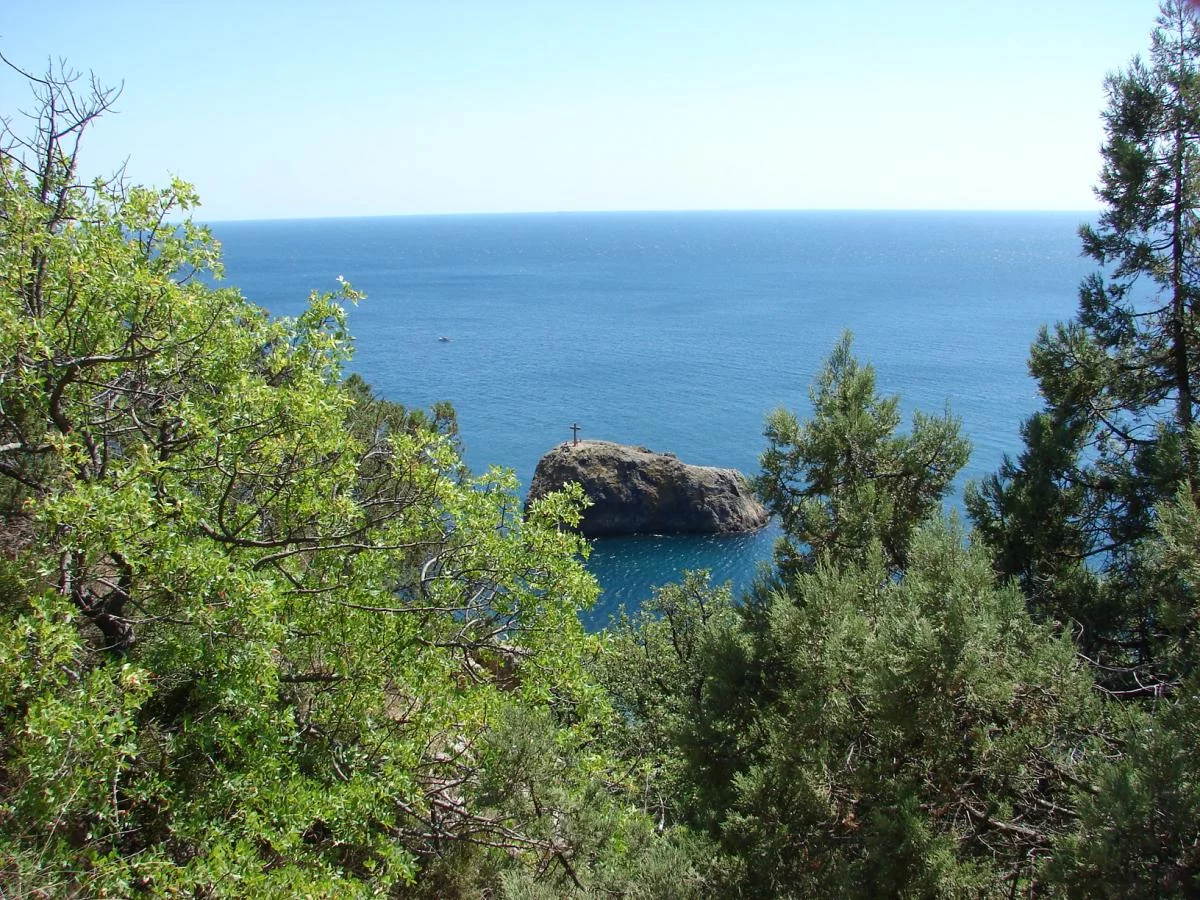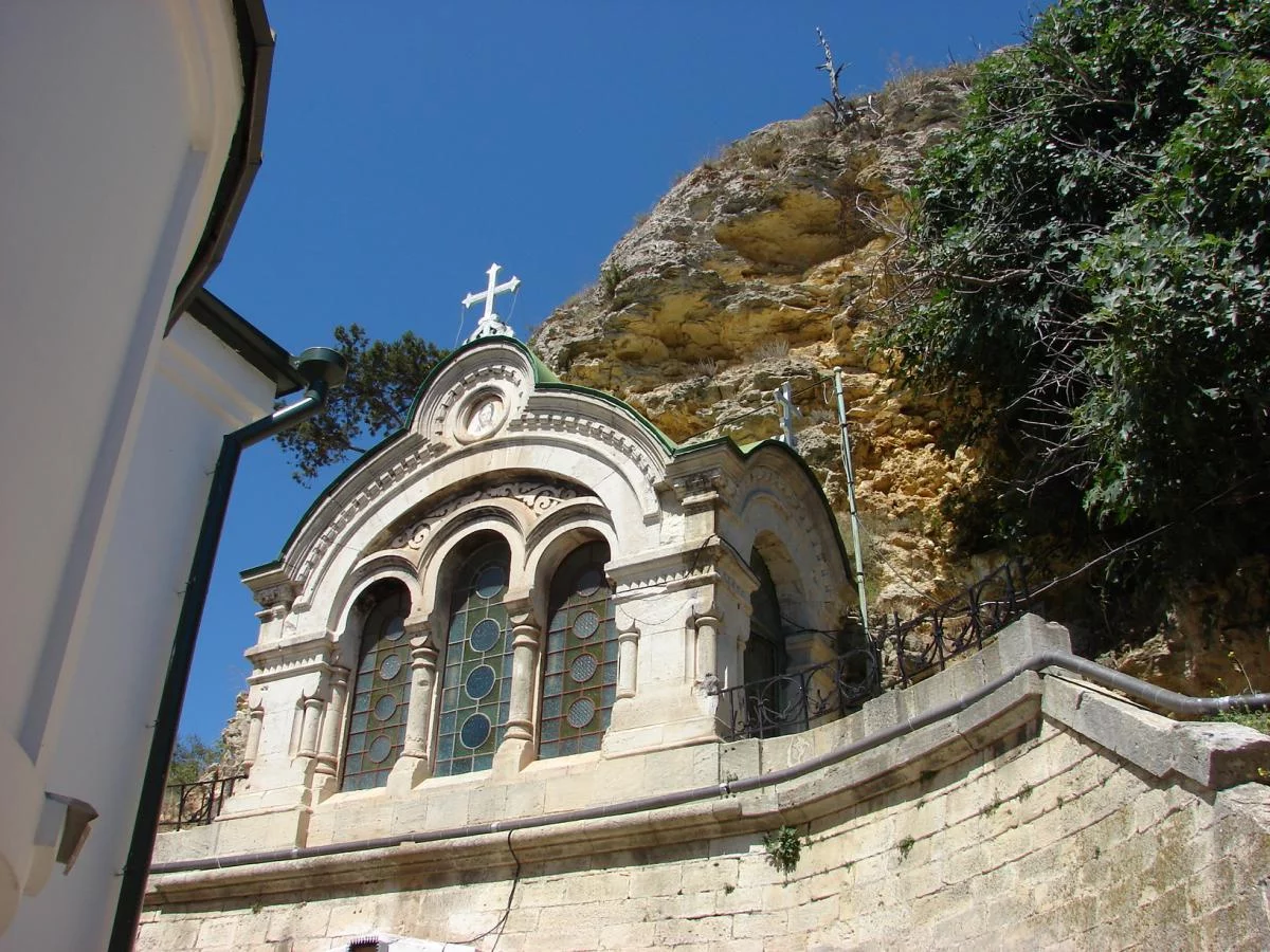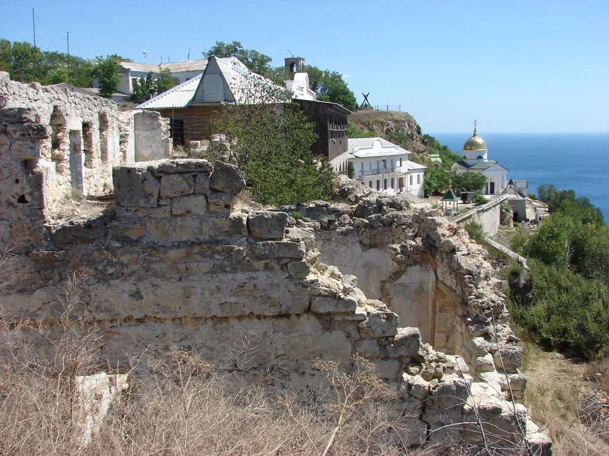 Косой крест правее, на выступе скалы над монастырём - памятник Андрею Первозванному.