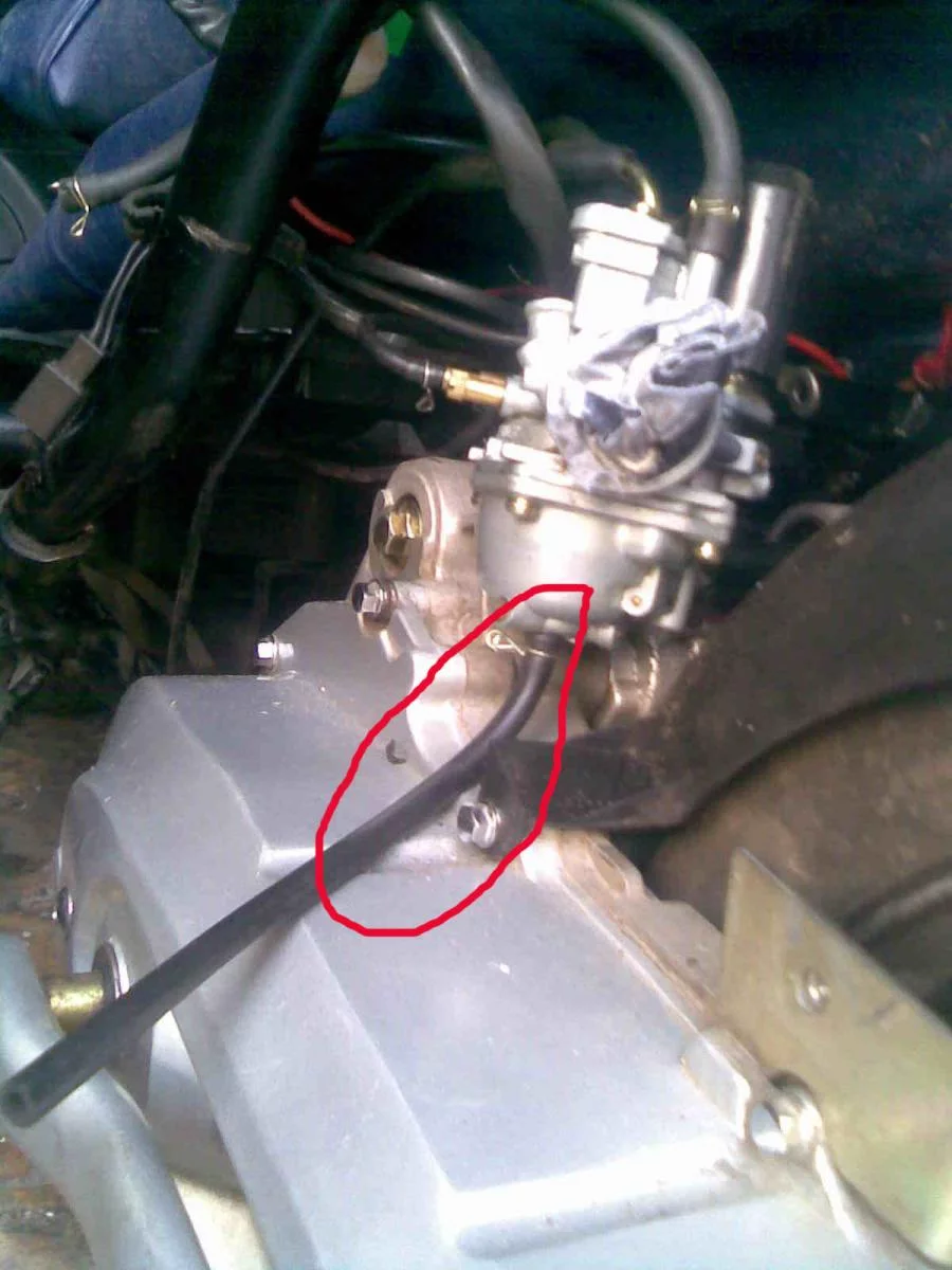 Китайский скут. Делали ремонт коллектора выхлопной трубы, разбирали полностью. Начали собирать, не можем понять, куда крепится шланг от карбюратора (шланг на фото). Голову всю изломал (в смысле не скуту, а себе), не знаю куда его деть и зачем он нужен!!???